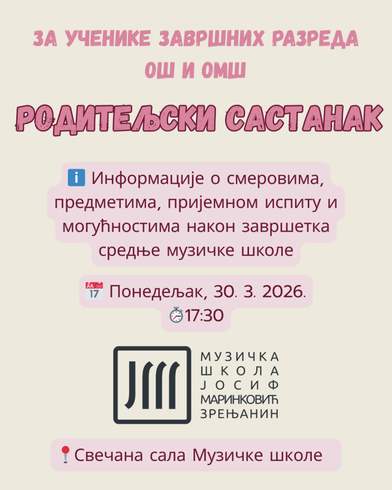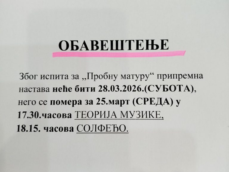 Сваке суботе од 9-10:30 часова, почевши од 31. јануара до 9. маја 2026. године, у просторијама наше школе одржава се БЕСПЛАТНА ПРИПРЕМНА НАСТАВА за упис у Средњу музичку школу „Јосиф Маринковић“ у Зрењанину.